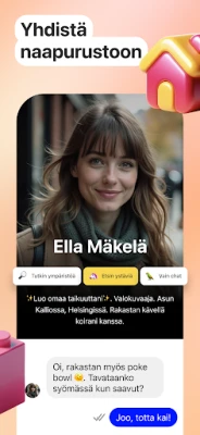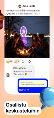 Kiki tekee alueesi helmien löytämisestä ja uusien tuttavuuksien solmimisesta vaivatonta. Sen sijaan, että pyyhkisit loputtomiin, Kiki johdattaa sinut suoraan merkityksellisiin keskusteluihin. Olipa kyseessä sitten vinkki lähimmästä kahvilasta, tiedotus alueen tapahtumista tai halu aloittaa ryhmäkeskustelu jaetusta harrastuksesta, Kiki tuo kaiken ulottuvillesi. Saat reaaliaikaisia päivityksiä naapureiltasi ja voit jakaa omat löytösi helposti, mikä syventää yhteisöllisyyttä ja tuo uutta virtaa jokapäiväiseen elämääsi. Kiki on suunniteltu rikkoamaan jää ja tuomaan ihmiset yhteen, tarvitsitpa sitten neuvoja, seuraa tai jotain siltä väliltä.