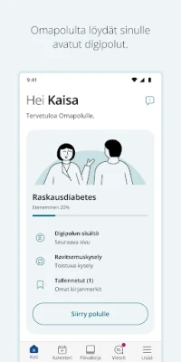 Koe terveyden- ja sosiaalihuollon asiointi uudella, vaivattomalla tavalla Omapolku-sovelluksen avulla. Tämä digitaalinen kumppani tuo olennaiset palvelupolut suoraan kätesi ulottuville, mahdollistaen oman tai läheisesi hoidon ja tuen hallinnoinnin missä tahansa ja milloin vain. Suunniteltu selkeyttä, käyttäjäystävällisyyttä ja korkeaa tietoturvaa silmällä pitäen, Omapolku tekee digitaalisista palveluista saavutettavia ja stressittömiä. Suurin osa tärkeimmistä digipoluista on nyt keskitetty tähän mobiilisovellukseen, tarjoten kattavan näkymän ja pääsyn tarvitsemiisi palveluihin.