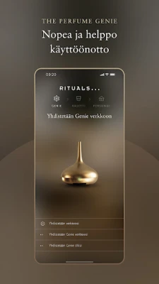 Perfume Genie vie tuoksunautinnon uudelle tasolle älykkäiden aikataulujen avulla, joiden ansiosta voit suunnitella tuoksurytmisi tarkasti omaan elämäntapaasi sopivaksi. Ei enää hukkaan meneviä suihkauksia – jokainen aromipilvi on tarkoituksellinen ja ajoitettu täydellisesti, esimerkiksi toivottamaan sinut lämpimästi tervetulleeksi kotiin. Voit vaivattomasti säätää tuoksun voimakkuutta mielialasi ja tilan mukaan, hallita laitteen LED-valoa, tarkistaa verkkoyhteyden tilan ja päivittää laiteohjelmiston suoraan sovelluksesta. Parannettu käyttöönotto visuaalisine opastuksineen ja personointivaiheineen varmistaa, että Perfume Genie on alusta alkaen todella sinun. Hallitse useampia Geniejä samasta sovelluksesta ja sukella 14 ylellisen Rituals-tuoksun valikoimaan, joista jokainen tarjoaa jopa 270 tuntia hienostunutta aromia.