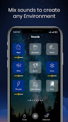 Rain Sleep Sounds & Meditation Music sisältää yli 70 korkealaatuista ääntä ja sävellystä, jotka on jaoteltu useisiin Relaxing Sounds For Sleeping -kategorioihin. Voit sekoittaa ja yhdistellä näitä ainutlaatuisia elementtejä luodaksesi täysin henkilökohtaisen äänimaiseman. Relaxing Music: Sound Machine -ominaisuuden avulla voit yhdistää sateen hiljaisen ropinan valkoiseen kohinaan tai ukkosmyrskyn matalan huminan lehtien kahinaan, räätälöiden täydellisen taustan kulloiseenkin mielentilaasi. Tämä mahdollistaa ainutlaatuisen, rauhoittavan tunnelman rakentamisen juuri sinun tarpeisiisi, tarjoten paon stressin keskeltä.
