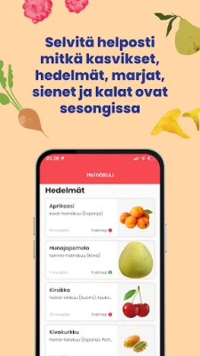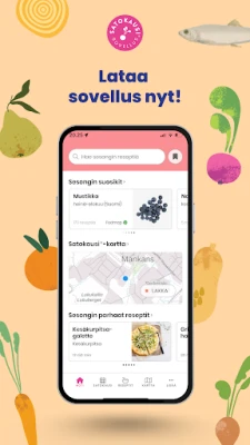 Sukella kotimaisen luonnon herkkujen maailmaan Satokausikalenteri®-sovelluksen avulla! Tämä ainutlaatuinen kumppani auttaa sinua löytämään helposti ja intuitiivisesti, mitkä kasvikset, marjat, sienet, hedelmät sekä kala- ja äyriäistuotteet ovat juuri parhaimmillaan kausittain. Olipa ruokavaliosi mikä tahansa, sovelluksen kattava reseptiarkisto tarjoaa ehtymätöntä inspiraatiota ja maukkaita ideoita hyödyntää näitä tuoreita raaka-aineita vastuullisesti ja luovasti keittiössäsi. Nosta arjen ruoanlaitto uudelle tasolle hyödyntämällä sesongin parasta antia ja nauttien puhtaista, kotimaisista mauista.