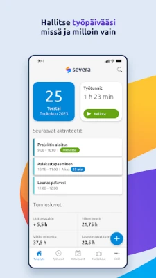 Severa-mobiilisovellus on suunniteltu modernille ammattilaiselle, joka haluaa hallita työtään tehokkaasti missä ja milloin tahansa. Tämä kattava työkalu mahdollistaa joustavan työskentelyn, antaen sinulle täyden kontrollin arjen rutiineihin ja tärkeisiin projekteihin suoraan mobiililaitteeltasi. Se on saumaton laajennus työhösi, joka pitää sinut ajan tasalla ja tuottavana.