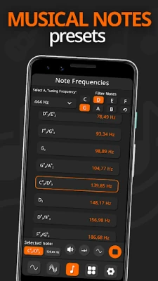 Intuitiivinen ja selkeä käyttöliittymä takaa vaivattoman navigoinnin eri toimintojen välillä, ja desimaaliarvojen tuki mahdollistaa äärimmäisen tarkan taajuuksien syöttämisen. Muokkaa Taajuusäänigeneraattori-kokemustasi laitteen asetuksista vaihtamalla teemoja, ottamalla käyttöön oktaavipainikkeet ja hienosäätämällä muita ominaisuuksia tarpeidesi mukaan. Muistathan, että puhelimen sisäiset kaiuttimet eivät aina kykene toistamaan äärimmäisiä taajuuksia täydellä laadulla. Korkeita taajuuksia kokeiltaessa on suositeltavaa laskea äänenvoimakkuutta kuulomukavuuden varmistamiseksi.
